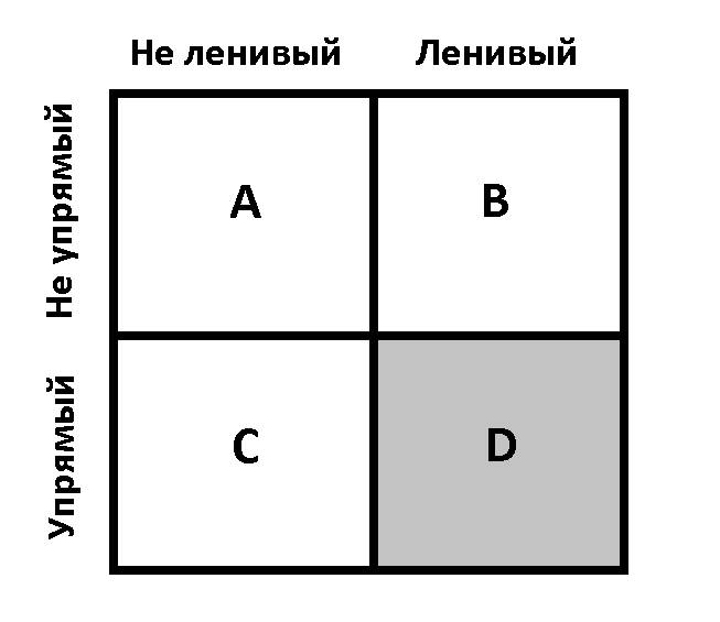 Квадрат C – упрямые и неленивые люди. Хороший вариант. Обычно, когда имеют в виду высокоэффективных людей, то говорят именно про них. Много работают, многое успевают сделать. Каждую задачу стараются выполнить успешно.
