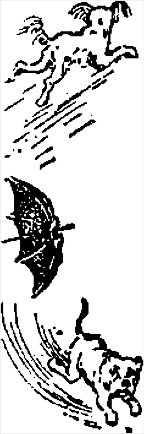 We went downstairs to breakfast. Montmorency had invited two other dogs to come and see him off, and they were whiling away the time by fighting on the doorstep. We calmed them with an umbrella, and sat down to chops and cold beef.