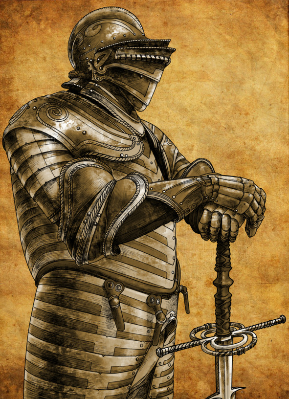 Говоря это, он с усмешкой кивнул на стоявший рядом эспадон. Тяжелый двуручный клинок стоял, опершись о камень, под некоторым наклоном, но все равно заметно возвышался над головой сидящего рыцаря. Тоже, к слову, немаленького.