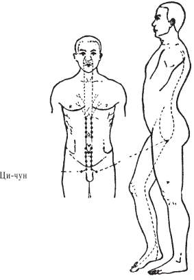 Когда внутренней Ци недостаточно в двенадцати меридианах, она, запасенная в восьми чудесных меридианах, возвращается обратно в двенадцать регулярных меридианов. Эти двенадцать меридианов подобны рекам и каналам, а восемь чудесных меридианов подобны озерам. Таким образом, функции восьми чудесных меридианов заключаются в том, чтобы поддерживать и регулировать двенадцать регулярных меридианов. Но восемь чудесных меридианов имеют свои собственные маршруты (рис. 13–20), чтобы принимать Ци и чтобы внутренняя Ци, запасенная в них, могла согревать органы тела изнутри и увлажнять поверхность тела снаружи.