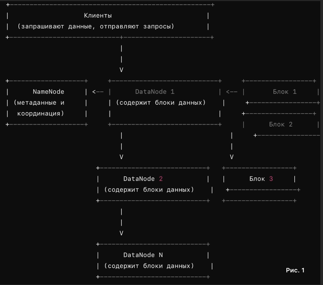 HDFS тесно интегрирован с другими компонентами Hadoop, такими как MapReduce и YARN, что делает его неотъемлемой частью всей экосистемы Hadoop. Он служит базой для различных инструментов и приложений, которые используют распределённые вычисления и большие данные, предоставляя надёжную и масштабируемую инфраструктуру для хранения и обработки информации. В конечном счёте, HDFS стал ключевым элементом, благодаря которому Hadoop получил широкое распространение в мире обработки больших данных и обеспечил революцию в этой области, позволив организациям эффективно работать с огромными объёмами информации. (Рис. 1)