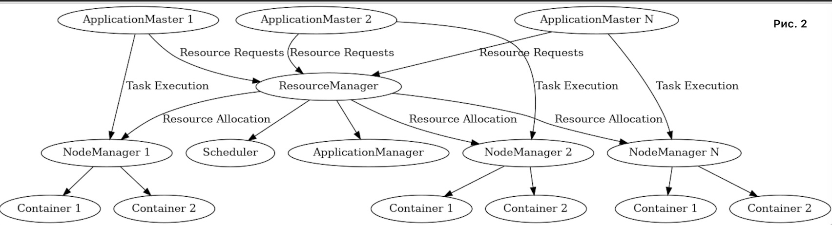 ApplicationMasters представляют разные приложения, которые взаимодействуют как с ResourceManager, так и с NodeManagers. (Рис. 2)