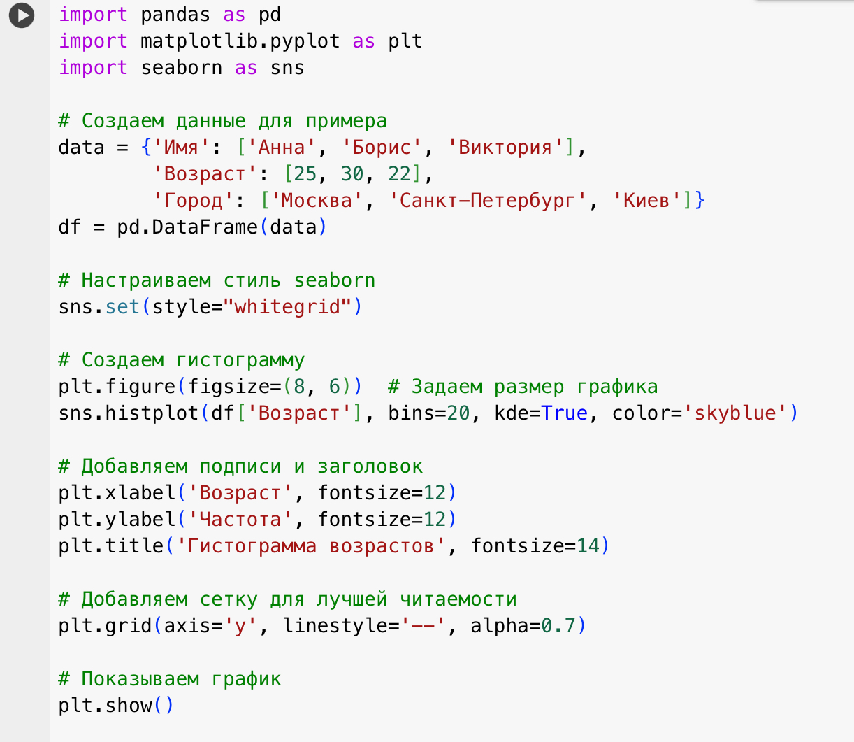 Эта строка устанавливает стиль для графика с помощью библиотеки seaborn. Здесь мы выбрали стиль "whitegrid", который добавляет белую сетку на фоне графика.