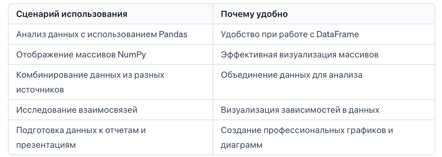 Ниже таблица предоставляет краткое описание сценариев использования и почему интеграция Matplotlib с NumPy и Pandas может быть удобной в каждом из них.
