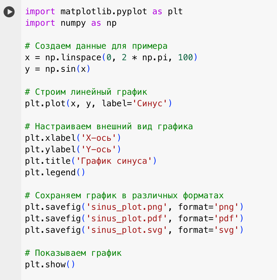 После выполнения этого кода, у вас появятся три файла (`sinus_plot.png`, `sinus_plot.pdf`, `sinus_plot.svg`), представляющие график в различных форматах. Это удобно для встраивания в отчеты, презентации или публикацию в различных медиа.