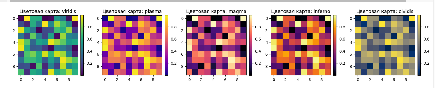 Давайте рассмотрим пример использования различных цветовых карт в Matplotlib. В этом примере мы создадим тепловую карту, используя различные цветовые карты для лучшего представления данных.