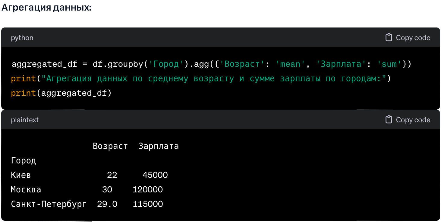 # Группировка данных по столбцу 'Город' и вычисление среднего значения возраста в каждой группе