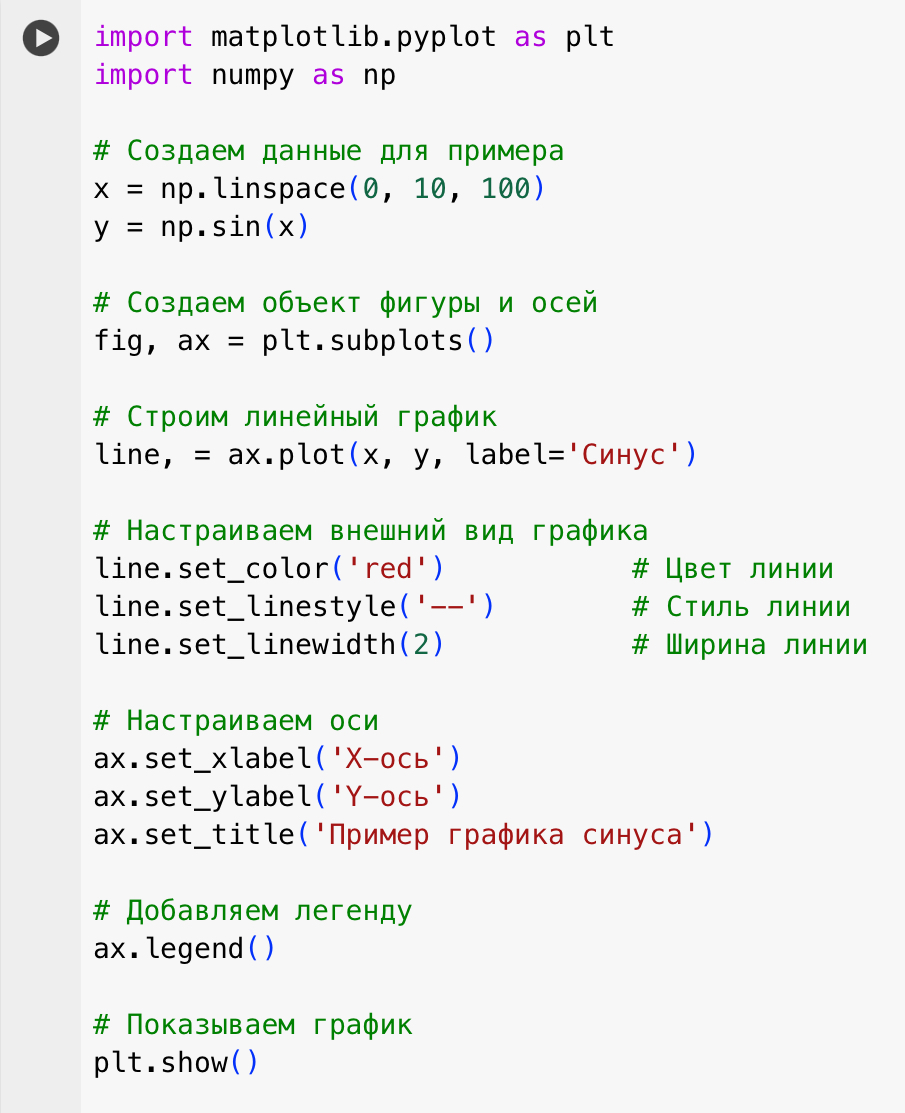 – Мы создаем данные и строим линейный график с использованием Matplotlib.
