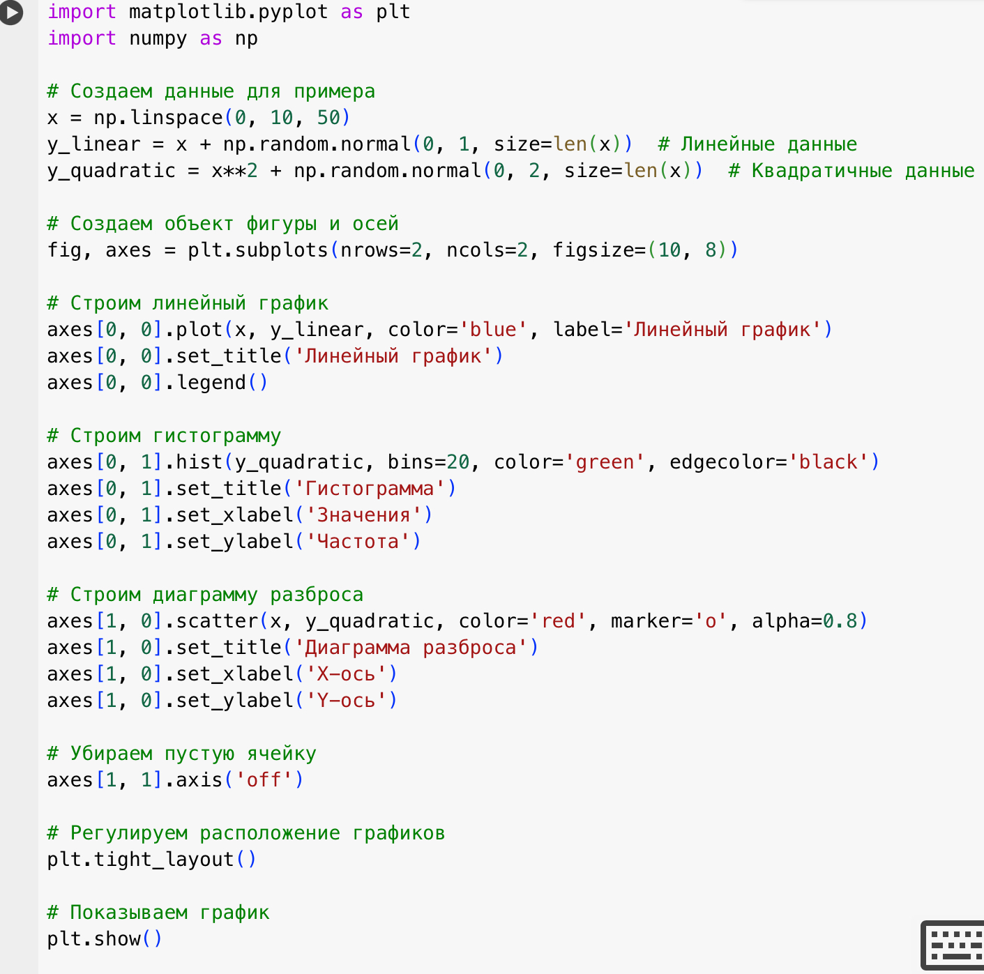 – Мы создаем данные для линейного графика (`y_linear`), квадратичной зависимости (`y_quadratic`).