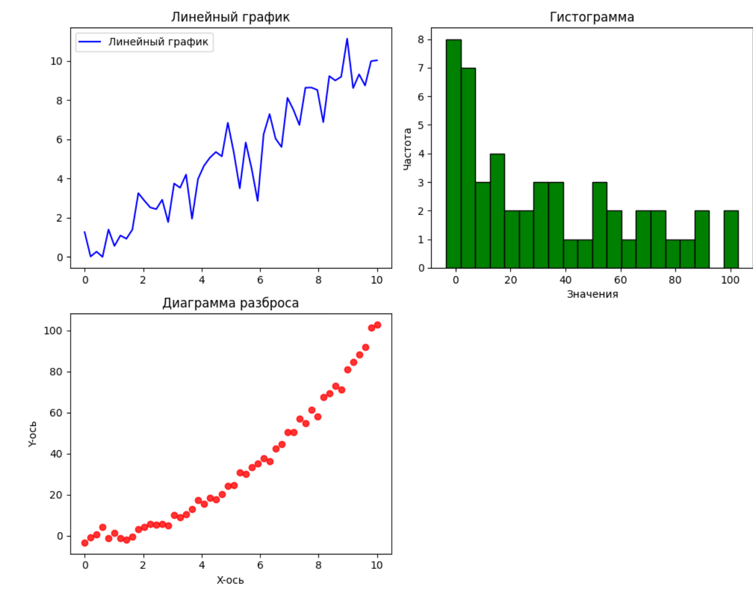 Давайте рассмотрим пример создания различных типов графиков с использованием Matplotlib. В этом примере мы построим линейный график, гистограмму и диаграмму разброса на одной фигуре.
