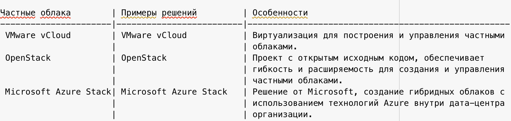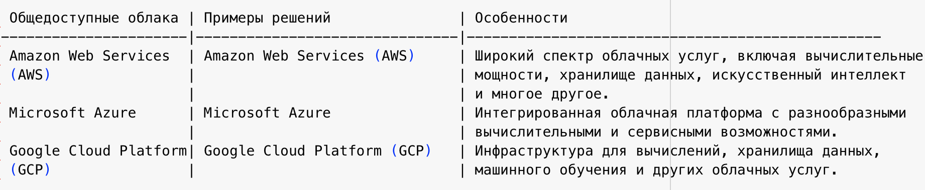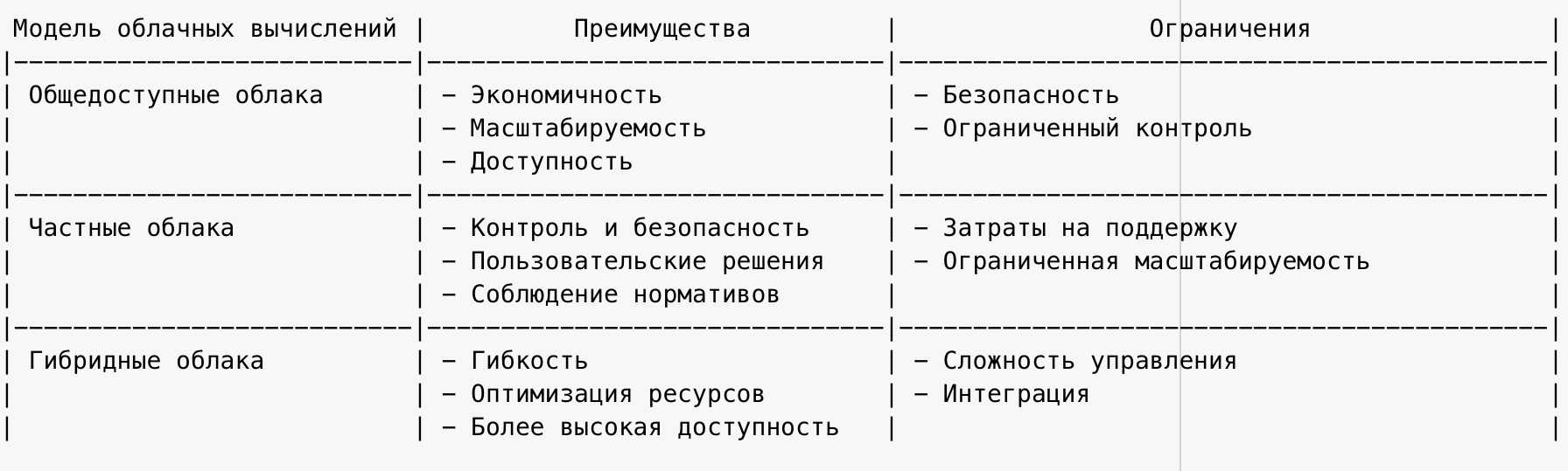 Предоставленная таблица сравнивает три основные модели облачных вычислений: общедоступные облака, частные облака и гибридные облака.
