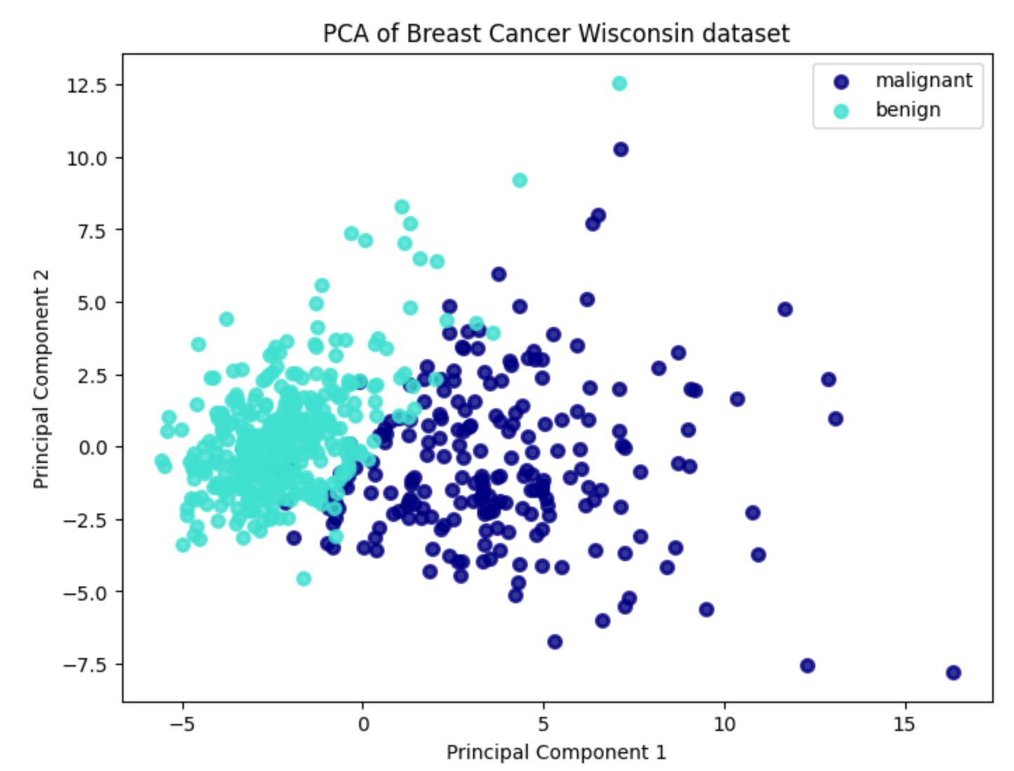 Этот код загружает набор данных Breast Cancer Wisconsin, стандартизирует признаки, применяет метод главных компонент (PCA) для снижения размерности до 2 компонент и визуализирует результаты. В результате получаем двумерное представление данных о раке груди, которое помогает нам лучше понять структуру и взаимосвязи между признаками.