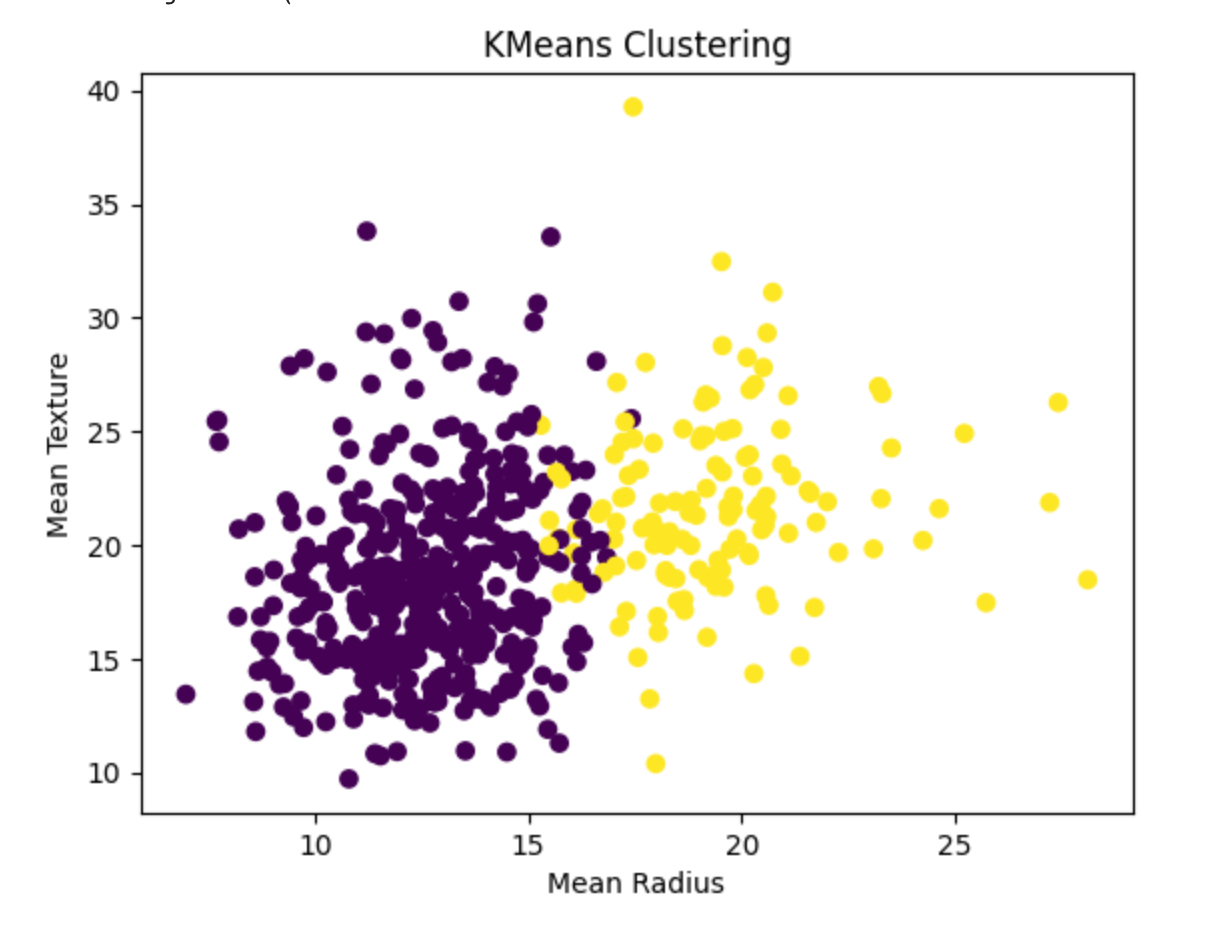 После обучения модели для каждого образца вычисляется метка кластера, которой он принадлежит. Затем происходит визуализация полученных кластеров на плоскости, используя два из признаков: средний радиус (`mean radius`) и среднюю текстуру (`mean texture`). Каждый образец представлен точкой на графике, а его цвет обозначает принадлежность к одному из двух кластеров.