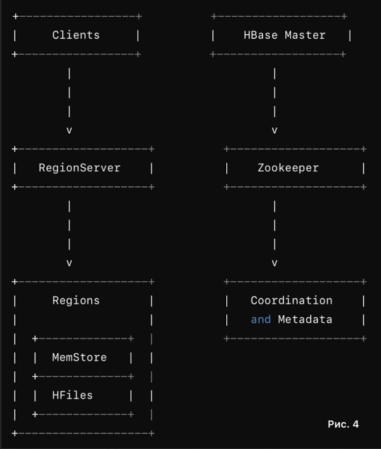 HBase обеспечивает эффективное хранение и обработку данных, используя распределенную архитектуру и ключевые компоненты, такие как RegionServer, HBase Master и Zookeeper. Процесс записи данных начинается с того, что клиент отправляет запрос на запись в HBase. Запрос сначала поступает к HBase Master, который определяет соответствующий RegionServer. На этом сервере данные попадают в MemStore, временное хранилище в памяти, где они накапливаются до тех пор, пока MemStore не заполнится. Затем данные записываются в HFile на диск, где они организованы по колонкам для оптимизации хранения и быстрого доступа. После записи в HFile, MemStore очищается, чтобы освободить место для новых данных. (Рис. 4)
