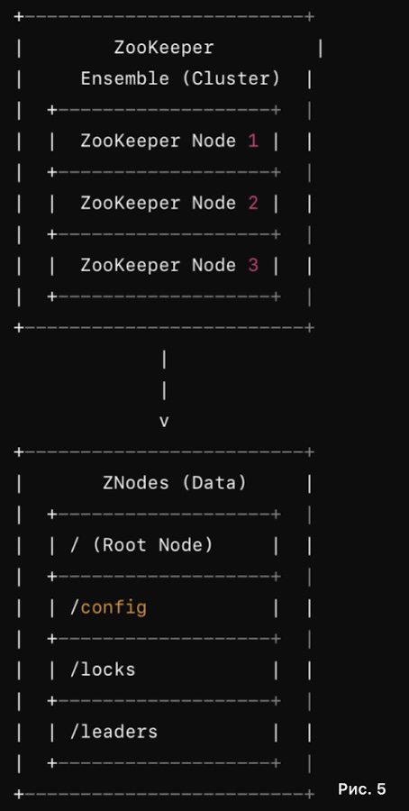 Эта схема помогает визуализировать, как ZooKeeper управляет данными и координирует процессы в распределенных системах, обеспечивая централизованное и надежное решение для управления конфигурацией и синхронизацией.