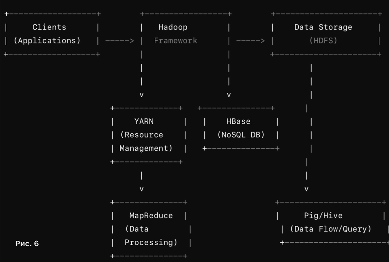– Pig/Hive: Инструменты для обработки данных и выполнения запросов, где Pig использует язык скриптов, а Hive – SQL-подобные запросы.