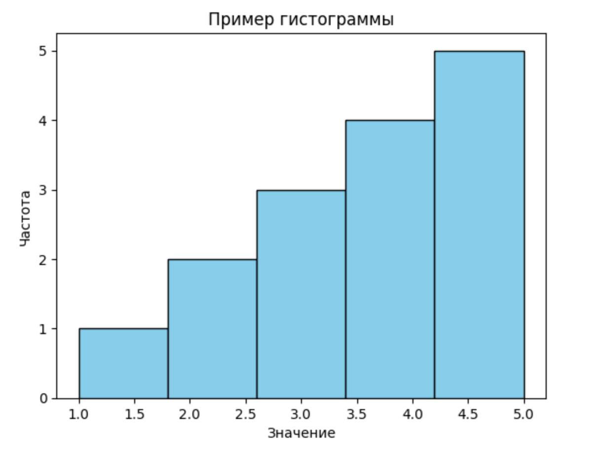 Этот код использует библиотеку `matplotlib.pyplot` для построения гистограммы. Для визуализации используются данные `data`, которые содержат значения признака. Гистограмма строится с помощью функции `hist()`, где параметр `bins` определяет количество столбцов в гистограмме. В данном случае используется 5 столбцов. Цвет гистограммы задается параметром `color`, а цвет краев столбцов – `edgecolor`.