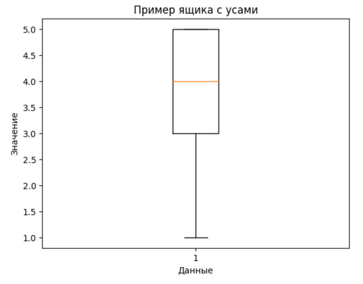 На получившемся графике мы видим ящик, который представляет межквартильный размах (от первого квартиля до третьего квартиля) и медиану (линия внутри ящика). Усы расширяются до самого нижнего и самого верхнего значения данных, а выбросы отображаются в виде точек за пределами усов.