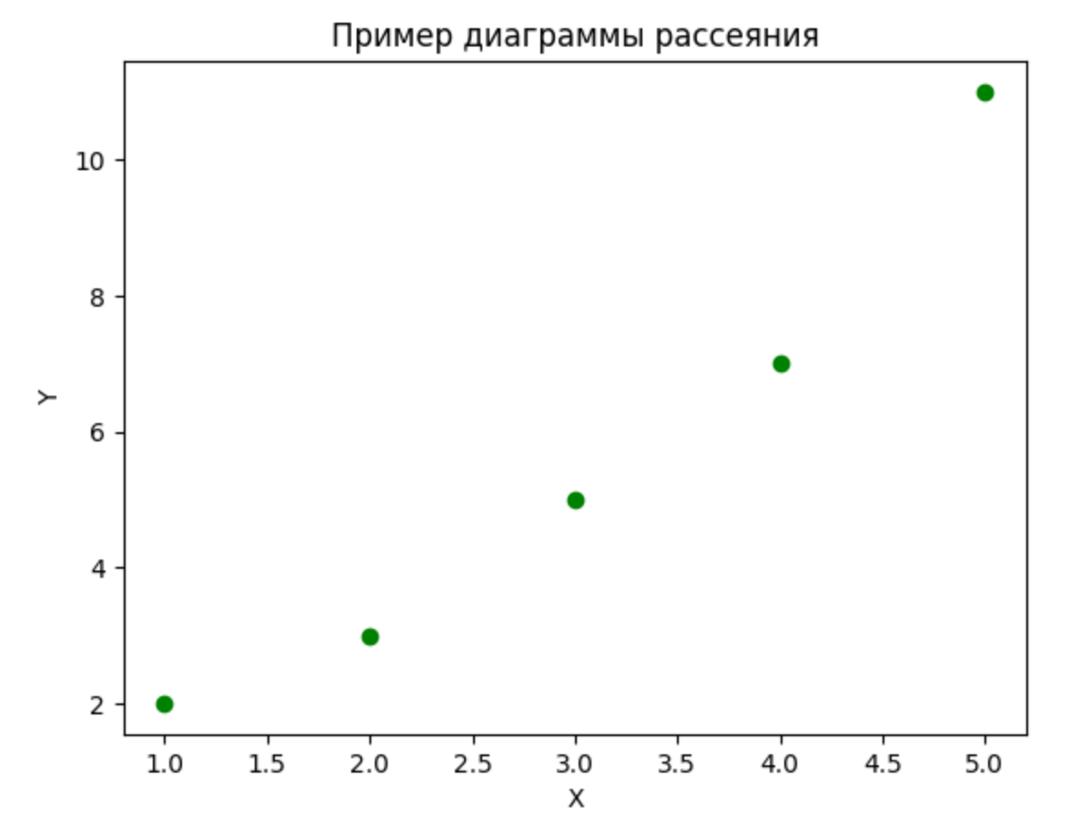 Этот код использует библиотеку `matplotlib.pyplot` для построения диаграммы рассеяния. Данные для визуализации представлены в виде двух списков `x` и `y`, которые содержат значения соответствующих переменных.
