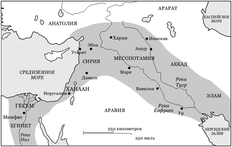 Плодородный полумесяц – регион на Среднем Востоке, в котором протекают две огромные реки, Тигр и Евфрат, которые берут начало в горах Турции и Ирана и впадают в Персидский залив; реки обеспечивают регион необходимым запасом воды. Самая плодородная земля находилась в регионе, известном как Месопотамия, который располагался между двух рек; земледелие начало свое развитие там к 9 000 году до н. э. В Плодородном полумесяце росли зерновые культуры, которые можно было «одомашнить» и выращивать, например, полба, ячмень, просо, лен, а также бобовые культуры – горошек и чечевица. Началось избирательное разведение коров, коз, свиней и овец из тогда еще диких местных видов (лошади были одомашнены только после 4000 г. до н. э., это произошло на территории России и Центральной Азии). К 7000 г. до н. э. на территории Плодородного полумесяца вовсю развивались крупные фермы, в основном они располагались в регионах, находящихся недалеко от рек или там, где часто шли дожди. Вскоре после 6000 г. до н. э. люди начали использовать простейшую систему орошения, к пятому тысячелетию активно строились искусственные каналы, резервуары для воды, осушались болота, что позволяло более эффективно использовать землю. Добавим к этому изобретение плуга и бороны – все способствовало увеличению запасов продовольствия, а значит, и население могло расти быстрее.
