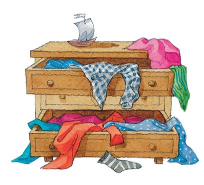 Динь сказала, что тень спрятана в большой коробке. Она имела в виду комод. Питер подскочил к комоду, выдвинул один за другим все ящики и вышвырнул их содержимое на пол. В один миг он нашел свою тень и так этому обрадовался, что не заметил, как задвинул ящик вместе с находившейся там Динь-Динь.