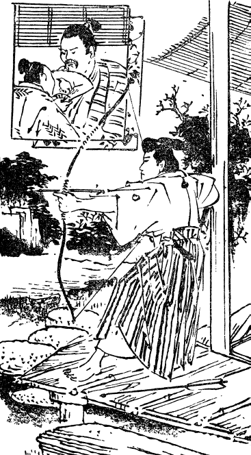 Таро приготовился к знаменитому выстрелу, как у Тамэтомо из Осимы. Послышался звук спущенной тетивы лука, а за ним веселый возглас удовлетворения Ацумицу. Выпущенная Таро стрела срезала ветки дерева, а не задетая ею цапля взлетела в кружеве лепестков облетевших соцветий. Ацумицу дал волю своему веселью при виде полнейшего провала стрелка. «Ха, обратите внимание! Даже птица издевается над негодным стрелком из лука. Она возвращается на прежнее место рыбной ловли». Однако, когда Ёкояма Таро с нахмуренными бровями, злобным взглядом и горящими от стыда щеками достал вторую стрелу, он услышал: «Э нет, ты свой шанс упустил! Не велика доблесть в том, чтобы поразить цель со второй попытки. Надо было использовать первую. Ты никудышный стрелок в любом случае и не заслуживаешь снисхождения как меткий лучник, который слишком любит пить вино. Пусть лук возьмет Кодзиро. Его репутация известна широко». Сукэсигэ оставалось только подать просительный жест, но Ацумицу уже обратился к Мицусигэ и продолжил свою речь: «Самурай Камакура знает вашего сына как самого сильного и меткого стрелка из лука в Канто на протяжении последних лет. Давайте дадим ему возможность подтвердить заслуженное звание. Соизвольте дать распоряжение по поводу вызова со стороны Ацумицу». Приглашение к состязанию в стрельбе только польстило самолюбию Мицусигэ. Он видел, что Таро очень разозлился, и ему не хотелось, чтобы у Сукэсигэ появился даже такой незначительный враг. Тем не менее распоряжение Ацумицу прозвучало однозначно, и отказаться он не мог. «Чтобы подстрелить птицу после угощения, требовалось нечто большее, чем просто сноровка. И все равно, пусть Кодзиро постарается. По меньшей мере, удача может ему улыбнуться, и он отомстит за Ацумицу-доно».