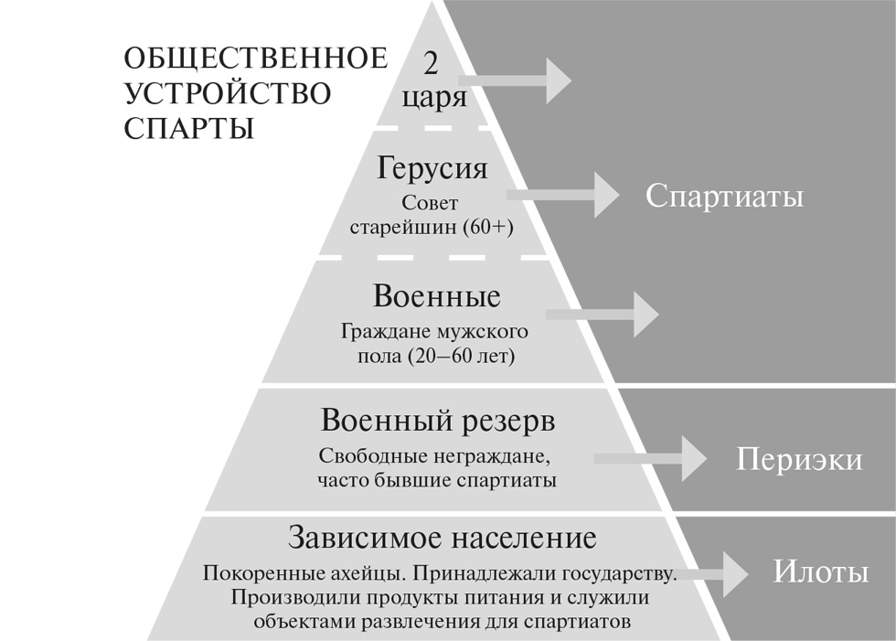 В самом низу располагались илоты, зависимое население, в основном из ахейцев, покоренных когда-то в Мессении и Лаконике. Илоты кормили спартиатов и становились жертвами ежегодных облав, на которых молодежь приучалась к войне. Склонность спартанцев порабощать другие греческие племена резко отличала их от жителей других городов-государств.