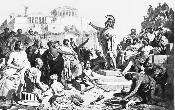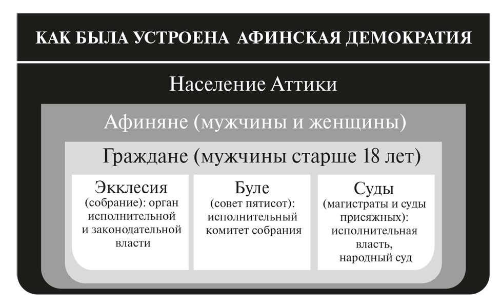 В Афинах экклесии стали проводиться на холме Пникс, и теперь уже все собравшиеся граждане имели право говорить. Места там хватало для без малого 6000 человек (примерно пятой части граждан города), а голосовали просто – поднятием правой руки. Сначала собрания проводились ежемесячно (потом стали собираться чаще) и останавливались, лишь когда начинался дождь – знак неблагосклонности богов. Изобретенный Клисфеном буле (совет) был «мозговым центром», где вырабатывались и принимались законы жизни города.