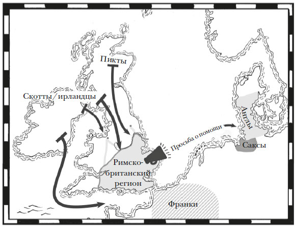 Вторжение или приглашение?Римские легионы навсегда покинули Британию в 407 г. ради сражений в бесконечных гражданских войнах. Обитатели Южной Британии обнаружили, что, хотя они платят налоги, их никто не защищает, так что «приняли решение отпасть от империи и отказаться от римских законов» (по Зосиму). Единственным источником для реконструкции последующих событий остается сочинение римско-британского монаха Гильды Премудрого «О погибели Британии» (ок. 540 г.). На латинском языке он пишет, что его сограждане сожалели о своем необдуманном разрыве с империей и возносили к римлянам ставшую широко известной последнюю мольбу о помощи – «Плач бриттов» (ок. 450 г.).
