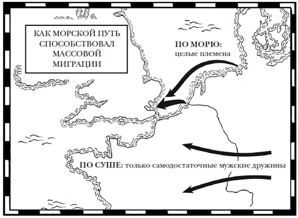 Так почему германские переселенцы остаются германцами только в Англии? Частично это произошло потому, что Британия к тому времени уже находилась в упадке и превратилась в землю, управляемую местными вождями, которых Гильда Премудрый называет тиранами. Пришедшие англы нашли одни лишь развалины. Не увидев ничего, что можно было бы перенять, они остались верны собственной культуре. Это удалось им благодаря другому важному фактору – морю. Ла-Манш не защищал Британию, а, напротив, делал возможным ее полное завоевание. Повсюду в Европе германские завоевания были делом вооруженных дружин, состоявших только из мужчин. Все племя целиком, включая стариков, кормящих матерей, маленьких детей, не могло пережить длинные переходы по суше на враждебной территории. А вот англы могли за день-два морем отправить целые кланы на Саксонский берег, где их ожидали удобно построенные и хорошо знакомые римские порты.