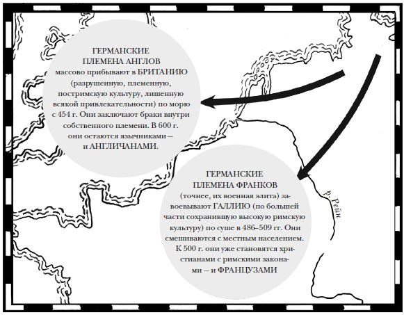 Итак, в Англии жители Римской Британии уцелели, но перешли на другой язык, как впоследствии сделало подавляющее большинство жителей Уэльса, Шотландии и Ирландии.
