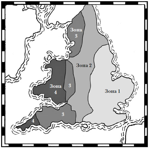 Карта названий рек Кеннета Херлстона Джексона. Зона 1 была завоевана к 500 г. и полностью англизирована. Зона 2 была завоевана к 600 г., и здесь многие реки до сих пор носят кельтские названия, что предполагает присутствие бриттов. Зона 3 – завоевание не закончилось до 700 г., и тут даже мелкие речушки имеют доанглийские названия. Это подразумевает, что население изменилось мало. Зона 4 сопротивлялась до последнего (как Корнуолл) или продолжает удерживать рубежи (как Уэльс)