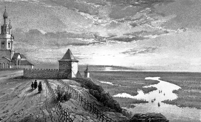 На следующее утро мы прибыли в Нижегородскую губернию. Казалось, что дороге, деревьям и длинным вереницам повозок – по двадцать, пятьдесят и даже по сотне сразу, везущих с ярмарки азиатские товары, – не будет конца, как вдруг с очередной возвышенности и поредевшего леса показалась Волга. Нижний (Нижний Новгород) расположен на склонах высокого мыса в месте слияния Оки и Волги. Замечено, что правый берег почти всех русских рек высокий, а левый – низкий. Так в основном обстоит дело и на той части Волги, где я побывал. Кроме того, Ока издалека видна с равнин юго-западнее нее, она огибает уходящие в голубую даль холмы до места, где стоит Нижний. Дорога, которая уже несколько часов была совершенно прямой, свернула налево, когда мы приблизились к этому месту, открыв нам вид на деревянный городок, в котором проходит ярмарка, и на небольшой лес мачт, тянувшийся вдоль рек за ней. Ярмарка расположена в низине между двумя реками у их слияния, и в августе и отчасти в сентябре это, вероятно, очень людное, если не одно из самых оживленных мест в мире, а в остальное время оно пустует. Застроена ярмарка строго регулярно: у всех улиц имеются названия, дома пронумерованы. В центре расположено большое каменное здание, в котором находятся резиденция губернатора, полиция, почта и прочие учреждения[116], а на окраине имеются русская церковь[117] и мечеть[118]. На территории ярмарки находится множество кафе, где, кстати, подают не кофе, а чай, и лучший в Нижнем ресторан. В ярмарочном городке под мощеными улицами проложены канализационные трубы – говорят, что их общая протяженность весьма велика. За порядком здесь следит особый казачий полк[119].