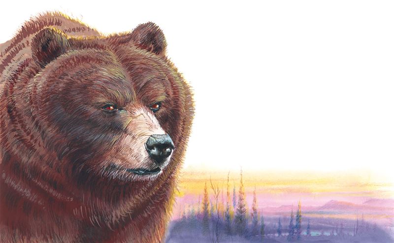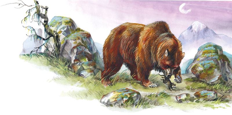 Ранние цветы уже покрыли солнечные склоны яркими коврами – красными, белыми, пурпурными. И всё живое пело: толстые сурки на скалах, важные гоферы[6] на своих холмиках, огромные шмели, перелетающие с цветка на цветок, ястребы, орлы, парящие над вершинами. Даже Тэр и тот по-своему пел: когда он всего несколько минут назад топтался в вязкой грязи, из огромной груди гризли вырывалось какое-то странное урчанье, не похожее ни на его воркотню, ни на рёв. Это значило, Тэр доволен – это была его песня. И вот прекрасный день вдруг как-то сразу померк. Не шевелясь, Тэр всё ещё принюхивался к ветру. Он был озадачен. Запах волновал его, хотя и не вызывал тревоги. Незнакомый запах действовал на гризли так же, как первый обжигающий глоток бренди на ребёнка. И низкое, зловещее, как отдалённый гром, рычание вырвалось у него из груди. Сознание подсказало наконец, что владыка этих просторов не кто-нибудь, а он, гризли, и появление здесь какого бы то ни было непонятного ему запаха – вещь просто недопустимая.