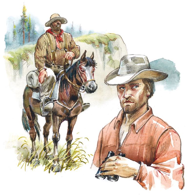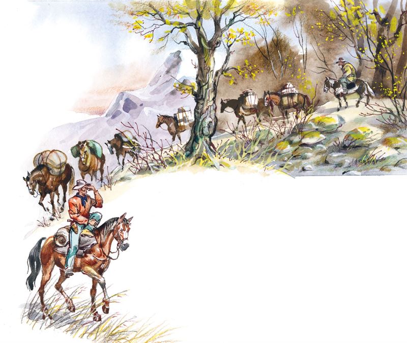 Но вот одна за другой все шесть вьючных лошадей экспедиции выбрались из чащи. Здоровенный детина верхом на индейском горном пони замыкал шествие. Он сидел в седле согнувшись, подтянув колени почти к самому подбородку: такая посадка выработалась у него за долгие годы жизни в горах, да и то потому, что нелегко, конечно, человеку шести футов и двух дюймов ростом ехать верхом на пони.