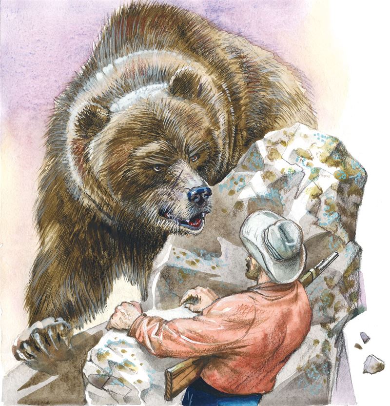 Взбираясь по отвесной стене ущелья, Ленгдон нечаянно столкнул камень. Тот сорвался и, падая, увлёк за собой другие, которые с грохотом обрушились вниз. Притаившийся внизу оврага Брюс беззвучно выругался. Он увидел, как Тэр сел на задние лапы, и приготовился стрелять, если гризли пустится наутёк.