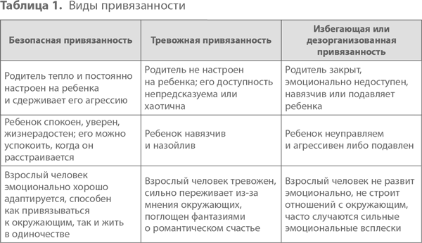 Как и в случае со многими болезнями, с тревожной привязанностью проще справиться, если диагностировать ее достаточно рано. К сожалению, особенности семьи, приводящие к проблемам в младенчестве, не меняются в достаточной степени, пока ребенок растет. Ребенок с тревожной привязанностью – довольно серьезная проблема для воспитывающих его родителей. Даже если мать стала стабильнее, отец доступнее, а финансовое состояние семьи благоприятнее, родители обычно не готовы дать ребенку ту терпеливую и настойчивую поддержку, которая нужна ему для того, чтобы восстановить надежное эмоциональное ядро (табл. 1).