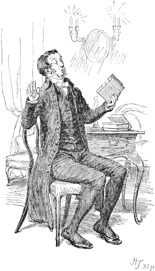 By teatime, however, the dose had been enough, and Mr. Bennet was glad to take his guest into the drawing room again, and, when tea was over, glad to invite him to read aloud to the ladies. Mr. Collins readily assented, and a book was produced; but, on beholding it (for everything announced it to be from a circulating library), he started back, and begging pardon, protested that he never read novels. Kitty stared at him, and Lydia exclaimed. Other books were produced, and after some deliberation he chose Fordyce’s Sermons. Lydia gaped as he opened the volume, and before he had, with very monotonous solemnity, read three pages, she interrupted him with:
