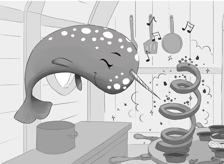 Как и у всех существ на Острове русалок-единорогов, у нарвалов есть своя магия. Благодаря очень длинному, закрученному в спираль рогу они могут заставить предметы изгибаться и принимать самые причудливые формы. Нарвалы придумали кручёную ириску: мою любимую конфету. И они соорудили потрясающие спиральные книжные полки в новой Стеклянной библиотеке.