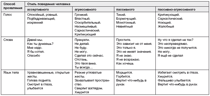 В отличие от людей нерешительных, человек уверенный и настойчивый (ассертивный), становясь агрессивным или пассивным, берет на себя ответственность за выбор такого стиля поведения. Например, если уверенный человек становится агрессивным, то он признает: «Да, я очень сердит». Ассертивные люди защищаются от чьих-либо попыток доминировать над ними любым способом, включая силу. Они используют агрессию для защиты, но никогда – для оскорбления.