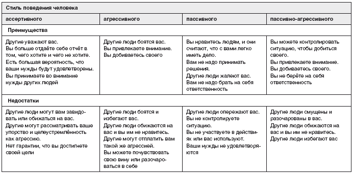 Таблица 2. Преимущества и недостатки агрессивного, пассивного и ассертивного стиля поведения