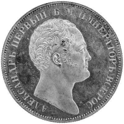 Рис. la. Серебряный рубль в память победы Александра I над Наполеоном и открытия Николаем I Александровской колонны на Дворцовой площади в Санкт-Петербурге в 1834 году. Выпущен в 1836 году. Аверс: портрет Александра I с надписью «Александр Первый Б(ожьей). М(илостью). Император Всеросс(ийский).». Фото любезно предоставлено Национальной нумизматической коллекцией Национального музея американской истории Смитсоновского института. Воспроизведено с разрешения Смитсоновского института