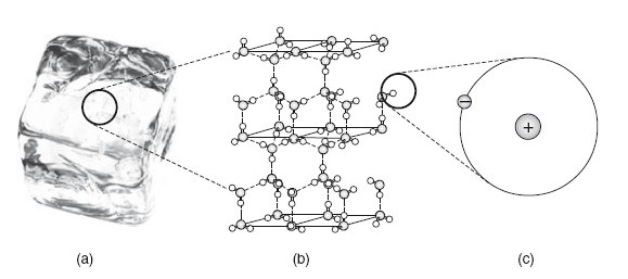 Кубик льда с длиной ребра 2,7 см весит около 18 г (а). Он представляет собой кристаллическую решетку, содержащую чуть больше 600 миллиардов триллионов молекул воды H2O (b). Каждый атом кислорода содержит 8 протонов и 8 нейтронов, а каждый атом водорода содержит 1 протон (c). Кубик льда, таким образом, содержит около 10 800 миллиардов триллионов протонов и нейтронов