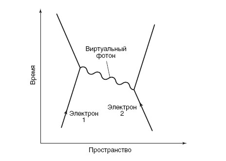 Схема взаимодействия двух электронов, как его описывает квантовая электродинамика. Электромагнитная сила отталкивания между двумя отрицательно заряженными электронами подразумевает обмен виртуальным фотоном в точке наибольшего приближения. Фотон назван виртуальным, так как его нельзя наблюдать во время взаимодействия