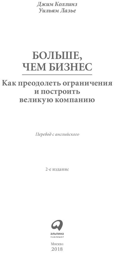 Больше, чем бизнес: Как преодолеть ограничения и построить великую компанию / Джим Коллинз, Уильям Лазье; Пер. с англ. – 2-е изд. – М.: Альпина Паблишер, 2018.