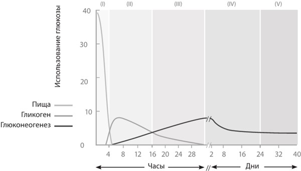Рис. 1.2. Пять стадий обмена веществ. Во время голодания уровень глюкозы в крови поддерживается с помощью расщепления запасов гликогена и выработки новой глюкозы с помощью глюконеогенеза