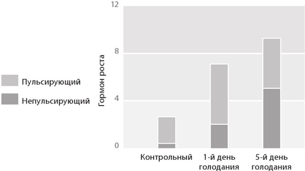 Самый мощный естественный стимул для выработки соматотропина – это голодание. Одно из исследований показало, что за пять дней без пищи выработка гормона роста удвоилась. Во время голодания в дополнение к обычному утреннему пику уровня этого гормона (пульсирующему) добавляется регулярная выработка в течение дня (не пульсирующая). Оба вида высвобождения гормона роста вырастают во время голодания. Что интересно, диеты с очень низким уровнем углеводов не способны вызвать такой ответ.
