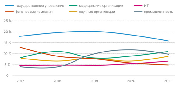 Динамика по отраслям, % от общего числа атак
