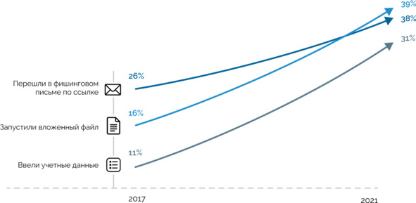 В-четвертых, как бы ни развивались технологии, узкое место – все равно люди. Так, с 2017 года количество людей, попадающихся на фишинговые письма, не только не уменьшилось, но, наоборот, кратно увеличилось. И в топе наиболее используемых и эффективных способов проникновения в компанию по-прежнему остается фишинг с помощью электронной почты. При этом темы рассылок, которые люди открывают чаще всего, остаются неизменными из года в год: зарплата, премии, социальные программы, ДМС, резюме. Кроме того, лучше всего работают рассылки, посвященные событиям в конкретной компании или подразделении. То есть растет роль социальной инженерии.