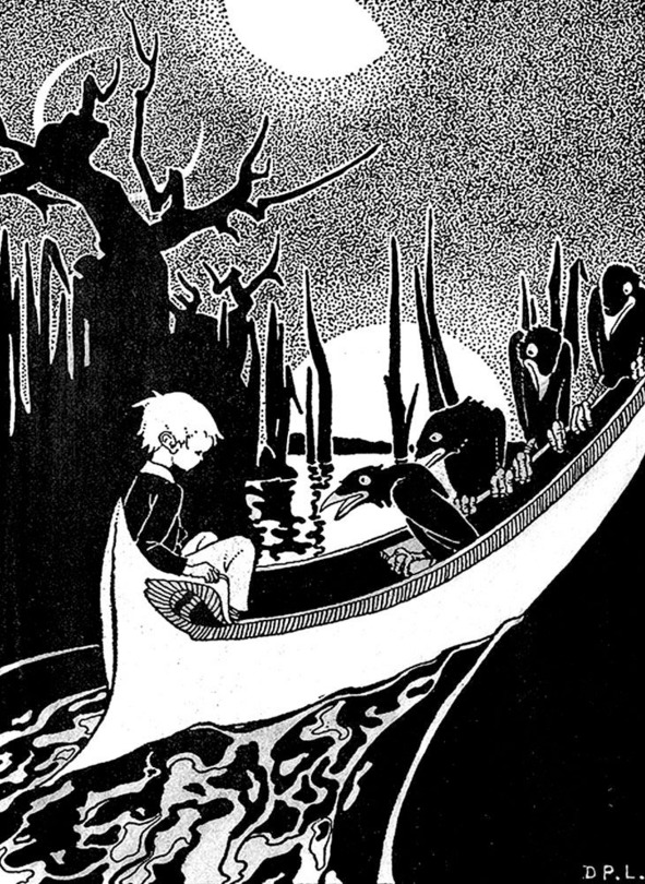 Когда Джек медленно открыл глаза, он понял, что наступила ночь: полная луна сияла; но была не совсем темная ночь: он мог отчетливо видеть каких-то черных птиц, которые выглядели, подобно воронам. В ряд они сидели на краю лодки.